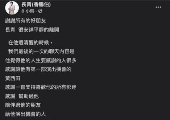《天天开心》主持人、曾演出《鸟来伯与十三姨》“香肠伯”的资深艺人长青(本名:吴新三)6月16日因心脏病发去世,享年76岁,小他31岁的妻子钟淑雅今凌晨发文感谢好友的关心,家属计划长青后事从简,这一、两天就会举行火化仪式,演艺工会理事长康凯也表示,其实想风光送走长青,无奈疫情严重。
