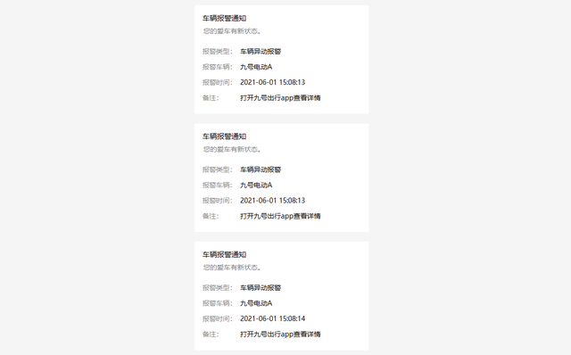 当车辆倾倒、移动或者大幅晃动时,九号电动车A40莎莉合作款的报警系统会立刻激活,在手机APP端以及微信公众号端立马会收到报警信息,实测从晃动到收到报警信息不到3秒。
