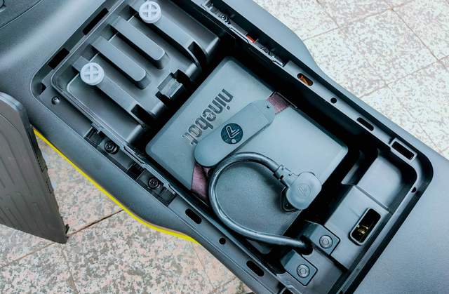 需要注意的是,所有九号电动车锁车除了锁死电机外,默认状态下龙头锁也同时锁定,想提起后轮推走都不太可能。如果想手动接触龙头锁,需要打开座桶,在电池仓里有一个小的提手,拉起即可。