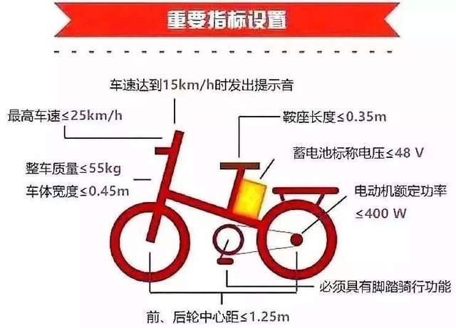新国标对“电动自行车”的标准是:最高时速不能超过25km/h,电机功率不能大于400W,电池电压不能大于48V且整车质量不大于55kg,同时必须拥有脚踏骑行功能。从各项的规定来看,新国标其实是对电动自行车的一种约束。