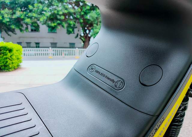 在机身用料方面,A40莎莉合作款延续了九号电动车的经典设计,包裹材料均是环保PP材质,这种材料不会造成污染,还可以100%回收利用,同时磨砂的表面不会反光,自然也不会出现“太阳纹”。机身的颜色并非后期喷涂,而是采用PP原色注塑,这样做的最大好处便是不怕刮碰,即使出现刮碰也不会出现颜色差异,因为整个包裹件的颜色表里如一。