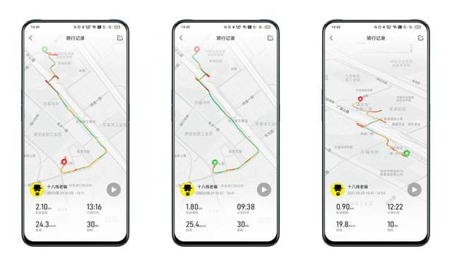 续航上,九号电动车A40莎莉合作款标称为55km,通过多次骑行记录可以大致换算出车辆实际的续航里程。从骑行记录上可以看到骑行1.8km消耗30Wh;骑行2.1km消耗30Wh,骑行0.9km消耗10Wh,而九号电动车A40莎莉合作款满电下电池容量为768Wh,换算下来实际续航里程为48km左右。