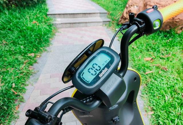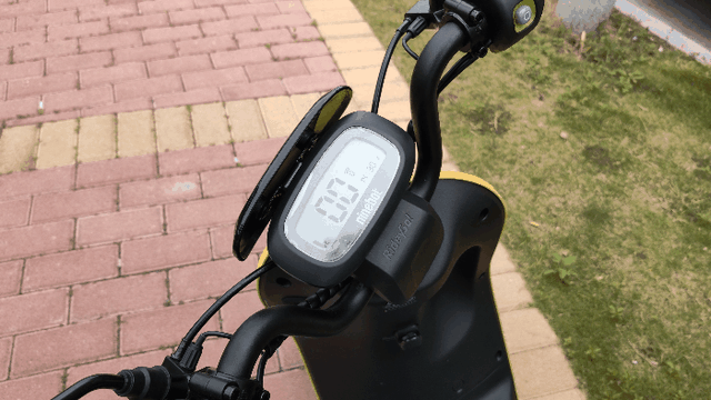 九号A40的仪表盘做了一些设计改变,形状从B系列的圆形变为现在的方形。外围一圈依旧显示当前电量,中间数字为实时时速,时速右下角还额外有一个时间显示。仪表盘前方有一个半透明的遮罩。