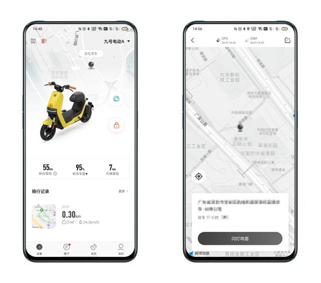 九号电动车拥有GPS+北斗+基站的三重定位,在APP端我们可以实时远程查看当前车辆的位置以及当前驻车时间(中间有异动会重新计算),便于用户第一时间发现车辆在停放期间是否被人移动。