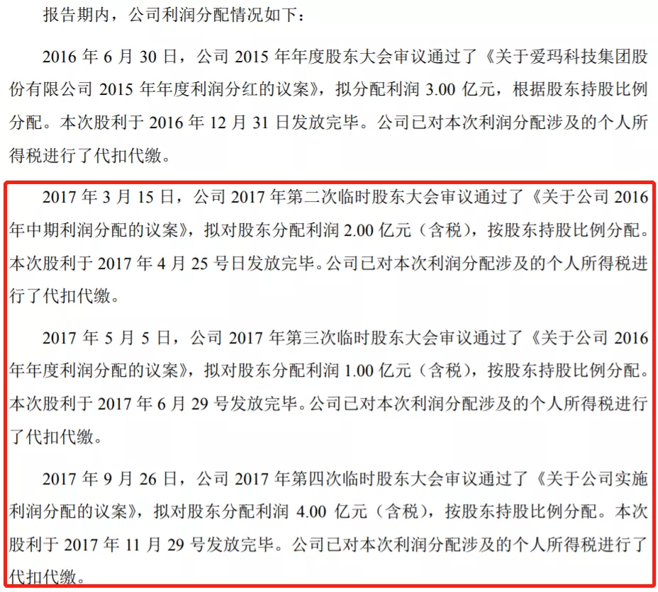更有意思的是,在爱玛科技2018年6月提交首版招股书之前,股东们竟然毫不客气的将公司当时赚的利润清仓式全部分完,然后才来股市融资。