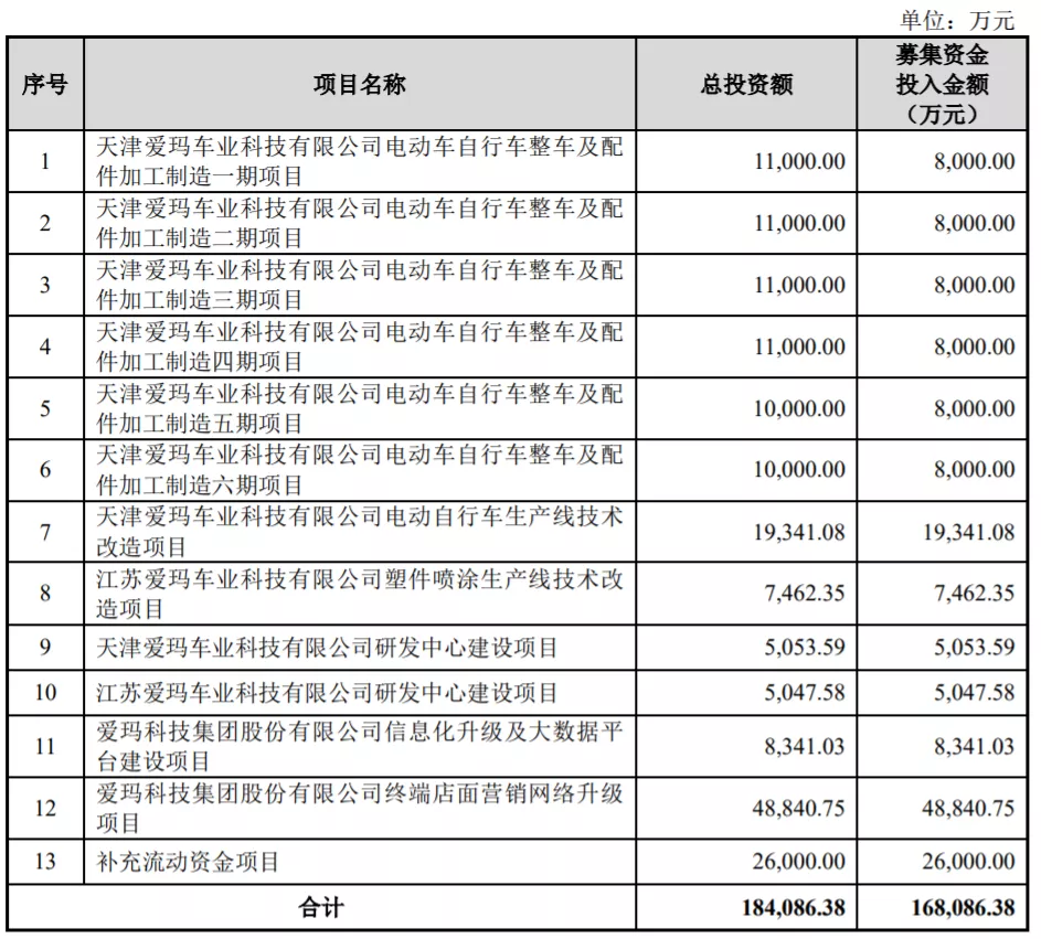 招股书显示,此次上市融资主要是为了爱玛电动自行车一到六期项目、生产线改造、研发中心建设以及补充流动资金需要,拟募资16.8亿,最终实际募资16.8亿。