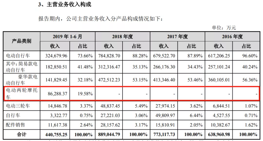 2019年8月版招股书中显示,2019年1-6月电动两轮摩托车收入8.63亿,2016年-2018年均无该项业务销售数据,但在最新招股书中却显示,2018年公司电动两轮摩托车销售收入6871.57万元。