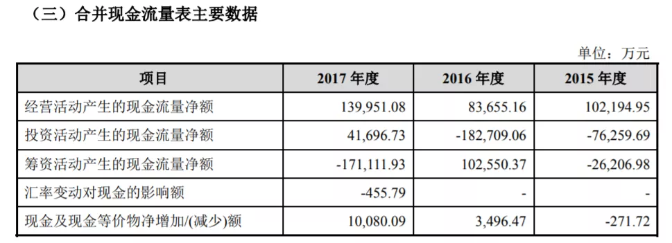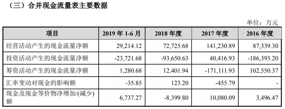 但在2019年8月报送的招股书中却显示,2016年、2017年经营活动现金流净额分别为87339.30万元、141230.89万元,投资活动产生的现金流净额分别为-186393.20万元、40416.93万元。