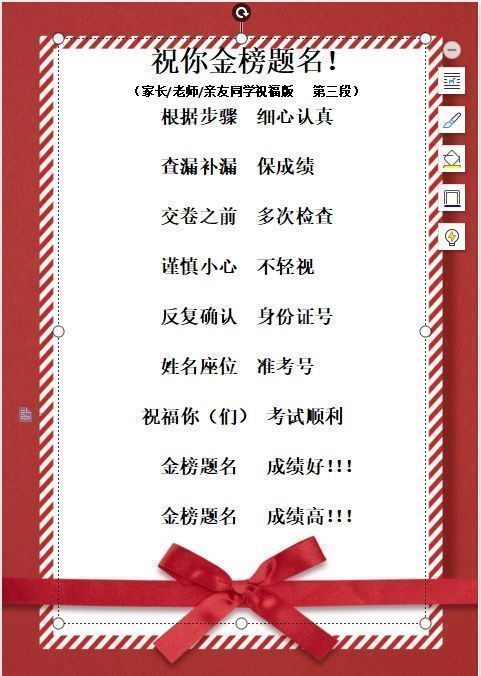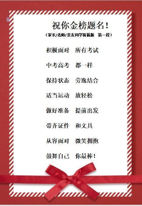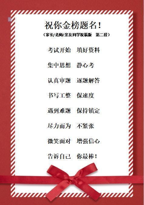 名为《祝我金榜题名》考试加油神曲的歌词就是整套的考试技巧,歌词详尽地描述了考试前大家应该怎么做好准备、考前心态的调整办法、考试时的注意事项、还有考试时不要忘记哪些关键步骤等等。即能舒缓压力、获得鼓舞,还能用歌词记忆考试方法和技巧,获得考试指导,真是一个不错的办法。