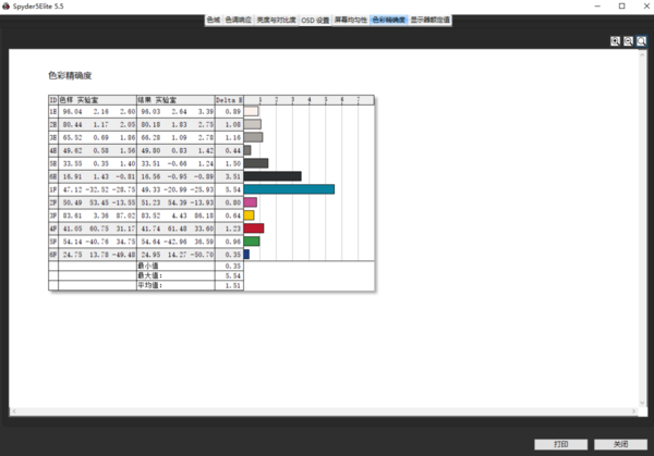 色彩精确度方面,可以看到这台显示器的△E最大值为5.54,最小值为0.35,平均1.51,在多数色样中有较好的还原度,两个△E大于3的色样显示方面色准还有待加强。