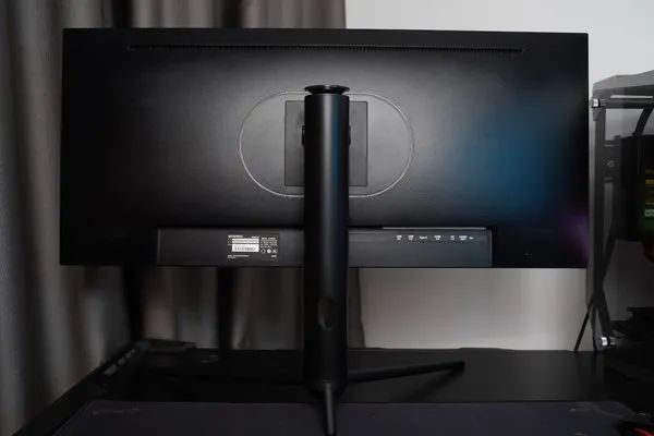 机身背面采用一体性较好的弧形表面设计,集中了支架接口、信号接口、音响单元、信息标签等元素,较为规整地排布在背面的中下部,此外支架接口周围还有一圈环形的RGB氛围灯带,开机后时刻变换颜色,是商务和朴素风格外观中的一点“潮”元素。