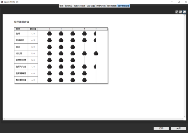 还有一些测试项目此处不一一展示,不过最终由Spyder软件给出了这台显示器的整体评级,满分5分中获得4分。可以看到其在色域、色调响应、对比度和色彩均匀度方面整体表现较好。