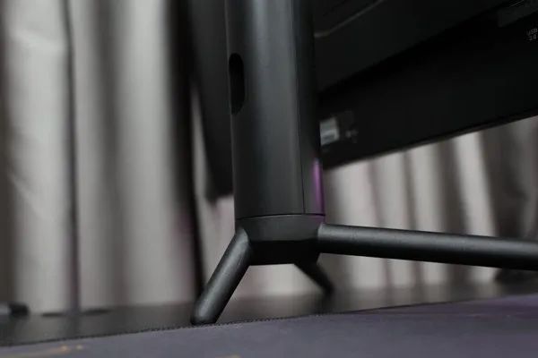 创维F34G4Q的支架也贯彻了其极简外观设计风格,主体采用粗壮的圆柱,搭配结实的金属长三点脚架,能够比较牢靠地支撑这台净重8.4kg的显示器,支架主体中下部设计有长圆形的集线口,便于用户将连接到显示器上的多种线路集束在一起,提高整洁度。
