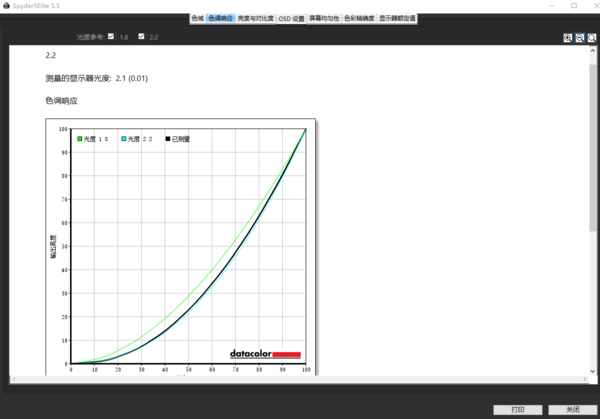 色调响应测试中,我们在OSD设置中将Gamma调至2.2,实测中约为2.1,从曲线来看较为接近2.2标准,色调响应表现较好。