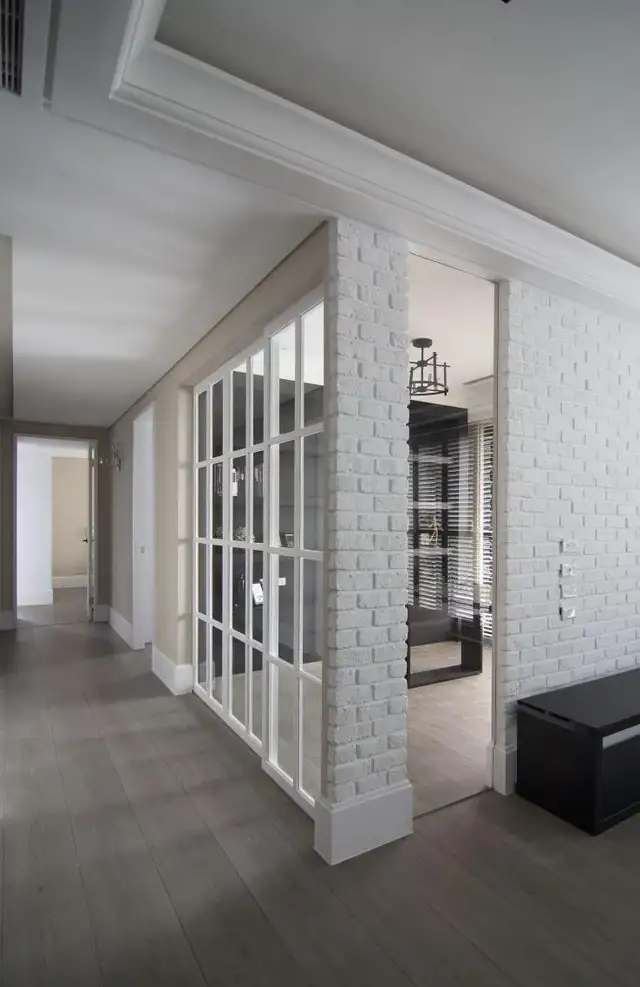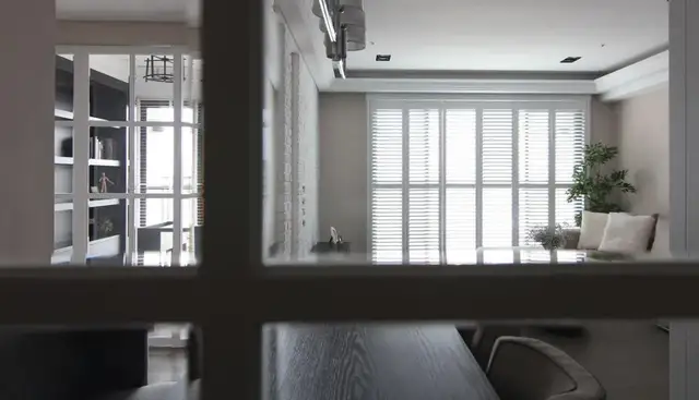 因为客厅的文化石主墙也是书房的隔墙,设计团队把玻璃格栅作为书房的拉门。