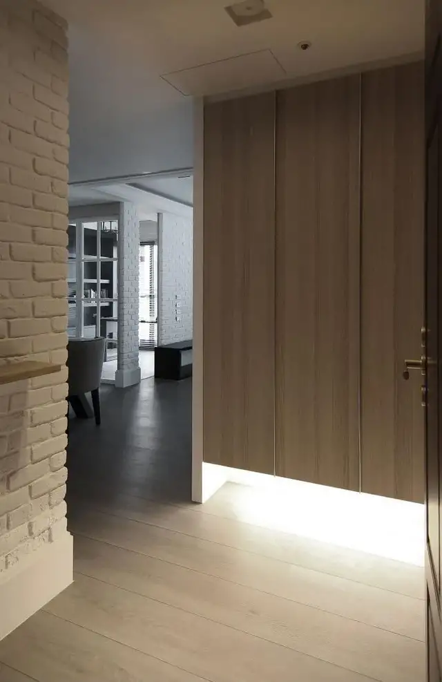 走进玄关,开门灯亮的贴心设计,在鞋柜下面配置光源,整体规划不仅结合风水思维,还消除了鞋柜形成的压迫感。