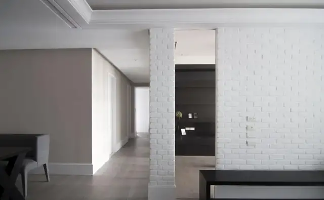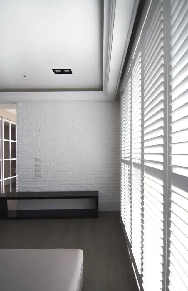 白色墙面空间利用文化石的电视背墙给空间带来艺术和文化感。