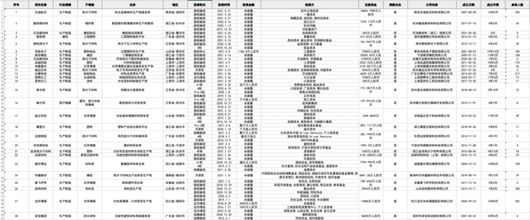 其中,最早成立的企业,是1981年成立于上海的【华昌聚合物】,华东理工大学华昌聚合物有限公司是一家防腐蚀解决方案提供商,主要从事耐腐蚀树脂、重防腐蚀涂料、阴极保护产品以及新材料的研制、生产与销售,并进行防腐蚀工程的专项设计、承包与施工,2018年底获得了一笔来自上海华谊集团的战略投资。而最近成立的企业,是今年1月成立于苏州的【威迈芯材】,是一家电子专用材料制研发生产商,成立2个月后便获得了来自亚威股份、亚威智能制造、沣盈资本的天使轮投资。