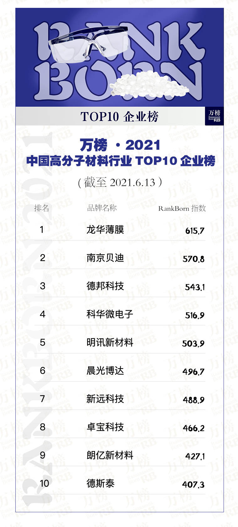 近两年来,国内高分子材料领域的投融资也十分活跃。2020年至今不到一年半的时间里,国内高分子材料行业已发生超过110起的投资事件、12起并购事件、9起IPO、3家挂牌。因此,万榜RB团队决定制作本期《中国高分子材料行业TOP10企业榜》,基于实时数据和科学算法统计出国内目前位于前列的高分子材料企业。