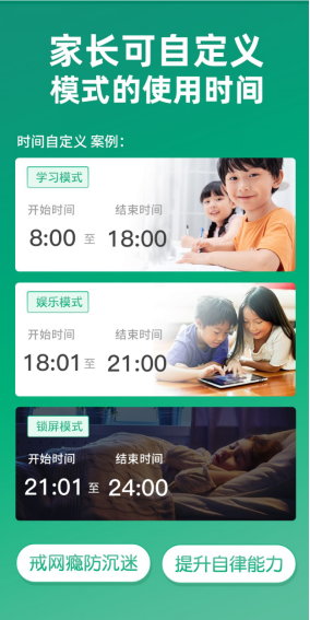 假如孩子手机网瘾严重,家长则可以主要使用应用管理+时间管理+应用统计三大功能来治服他们。应用管理是需要家长把孩子手机上的应用全部进行分门别类,比如学习为一类,娱乐、禁用又分别为两大类。接着使用时间管理功能,依照对应的生活场景一键设置学习模式、娱乐模式、锁屏模式或者自定义模式,以及设置每个APP、小程序、快应用的时间和时长。这样就能行之有效地约束孩子们玩手机了。最后,应用统计功能是起总结作用,它能统计孩子一天、七天以及一个月以内的应用使用实况,并会有概率占比图显示出来,让家长明明白白看清楚孩子的时间到底去哪了,并对此做出人为干预。