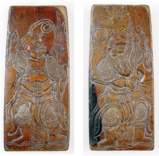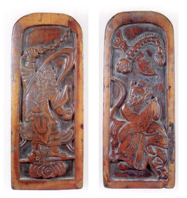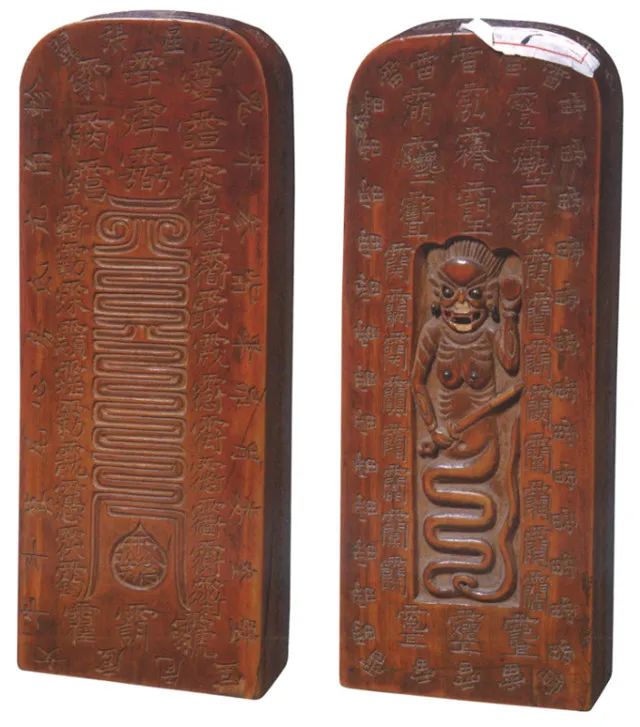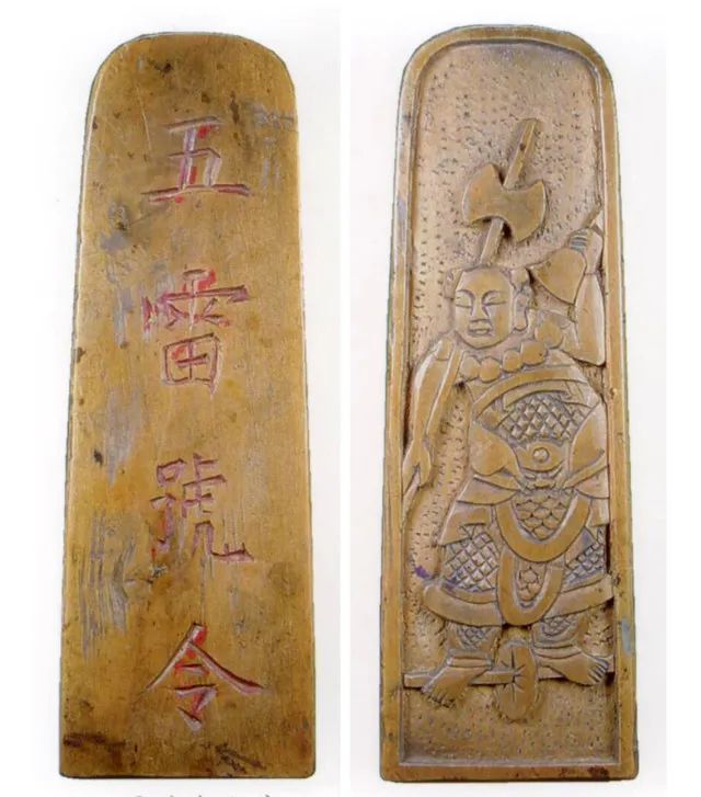 天师令。正面浮雕祖天师张道陵,天师龙眉豹眼,额有天目,宾角胡髯,头戴紫金冠,双手拱举,跨坐猛虎背上。头上有蜈蚣、蝎子、毒蛇、蜈蚣、蟾蜍、壁虎五毒,有驱邪镇宅的寓意。背面浮雕王灵官,头戴紫金冠,怒目瞪眼,额有天目,赤发红髯,左手高举金鞭,右手掐灵官诀,身披金甲,外罩战袍,足踏火轮,威严凶猛。