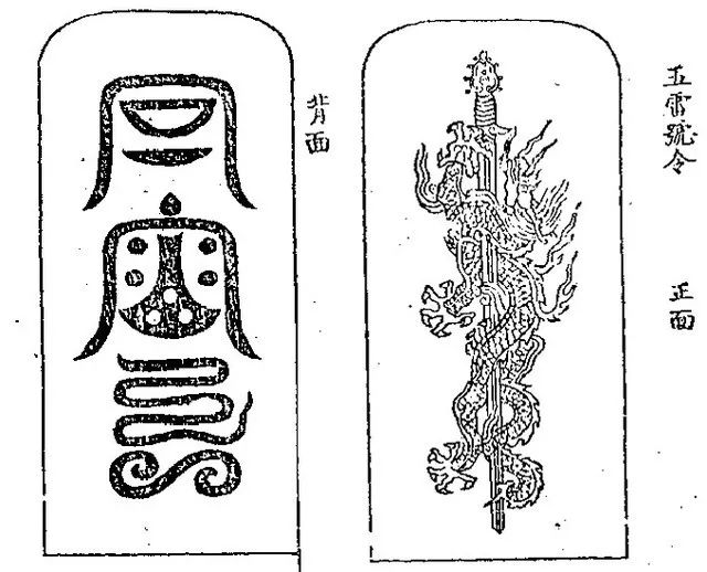 五雷号令,宋代神霄派所传。明周思得《上清灵宝济度大成金书》卷二五云:“右令牌取雷击枣木造成,长五寸五分,阔二寸四分,厚五分。选择吉日,依式造之,四侧周围刊二十八宿名,以锦囊盛之。”正面浮雕一把宝剑,剑柄在上,锋刃在下,剑身蟠绕一条金龙,金龙爪为五爪,缘剑刃而绕至剑柄,龙头在上,龙尾在下,龙身上部带有明显的火焰纹。背面文饰简洁,仅为云篆化“五雷号令”四字。