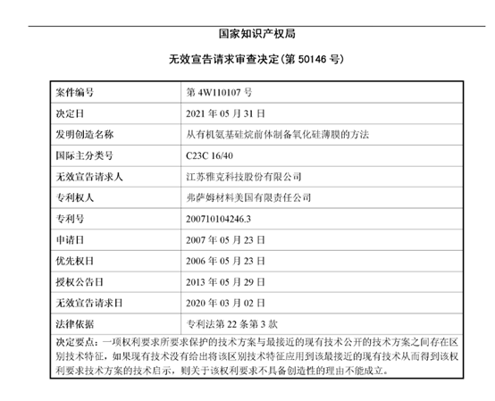 雅克科技于2020年3月向国家知识产权局提出了无效宣告请求,涉及专利为弗萨姆材料的“从有机氨基硅烷前体制备氧化硅薄膜的方法”发明专利,该专利申请日为2007年5月23日,授权公告日为2013年5月29日。
