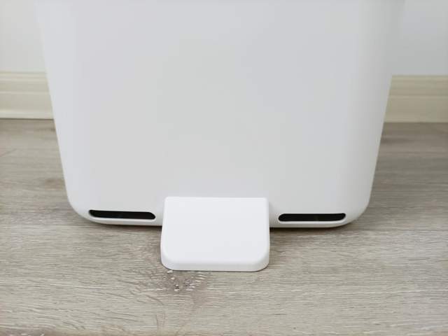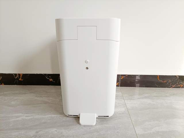垃圾桶正面只有一个触摸按键,可以实现打包、换袋功能,操作非常简单。垃圾桶的背面中间部位是一个电源键和一个充电端口,底部是两个出风口和一个防滑底座,实现自动装袋的功能和保证垃圾桶不会在开盖的情况下倾倒。