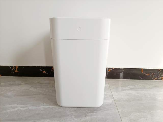 首次打开包装使用前,一定要记得先打开垃圾桶背部的电源开关。此时垃圾袋并没有贴合在垃圾桶壁,长按桶前面的触摸按键,听到“嘀”声后,稍作等待就可以自由使用了。