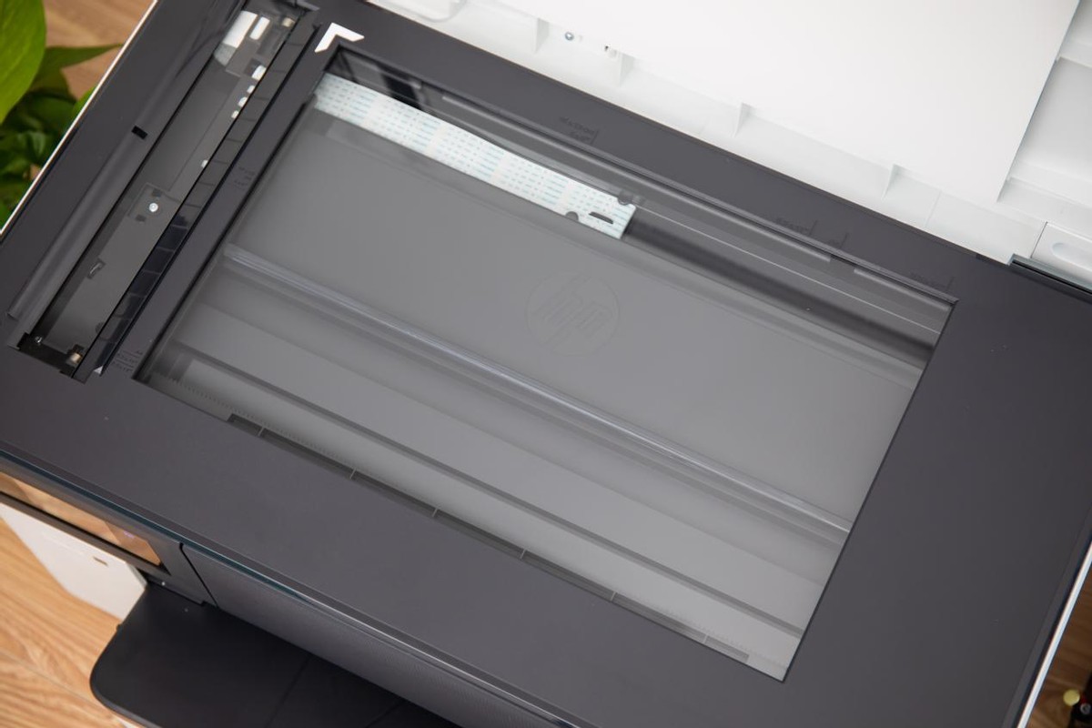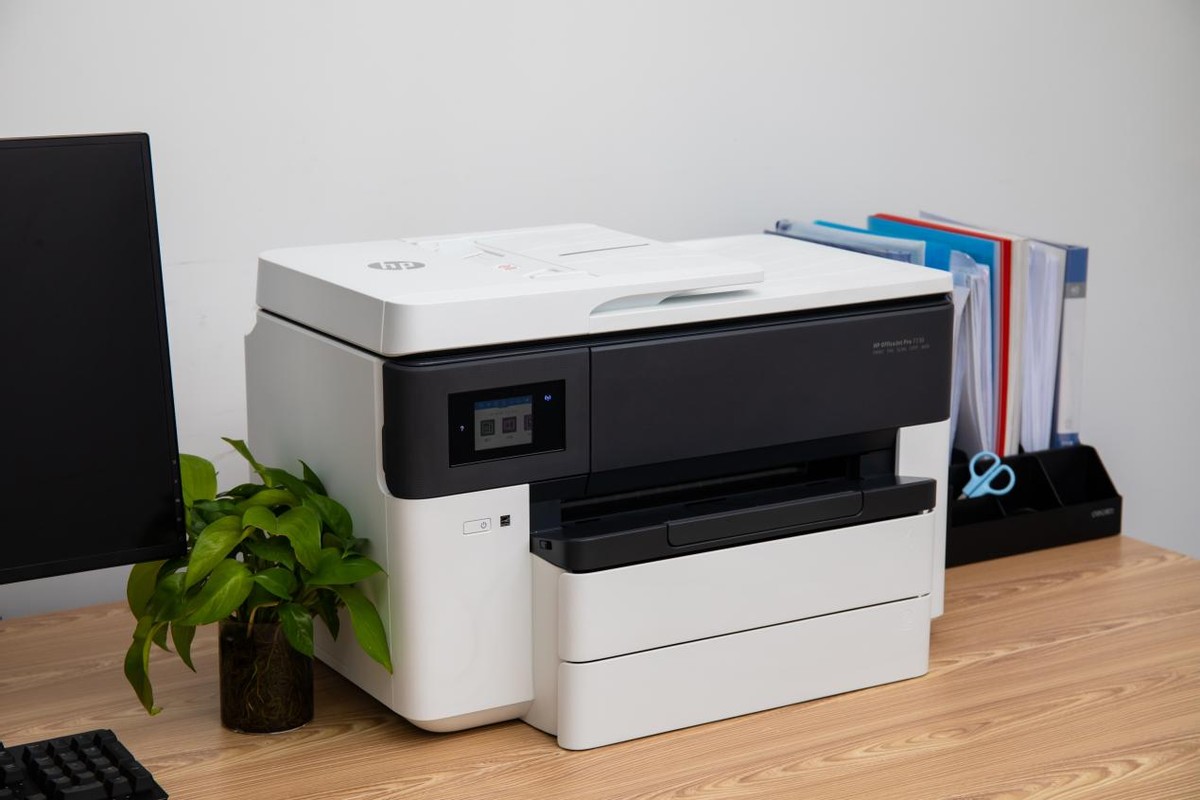 惠普7730尺寸为长584.9mm,宽444.8mm,高385.8mm,比起家用型产品,体积不算小,但在商用领域的话,由于整个布局立体紧密,功能齐全的同时,体积又控制适中。像我们这样,放在办公桌面一角,即可方便使用。