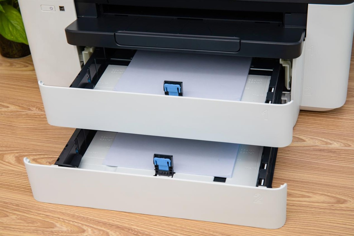 惠普7730比较厚道配备上下两个纸盒,两个纸盒都支持像A3、A4这样不同尺寸纸张,一个装A4,一个装A3,减少频繁的换纸操作,用起来省心省事。