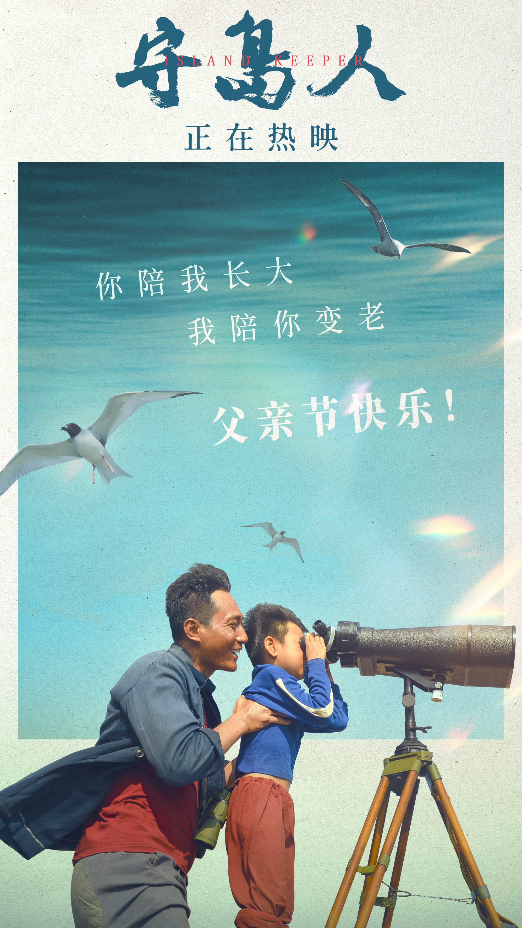 在庆祝中国共产党成立100周年之际,根据“人民楷模”王继才同志守岛卫国感人事迹创拍的电影《守岛人》发布“父亲节快乐”海报,海报中王继才的小儿子志国站在望远镜前,父子俩开心的笑容让人动容!电影《守岛人》正在热映中!