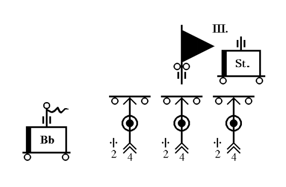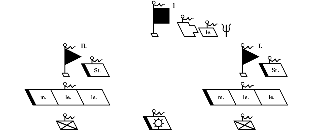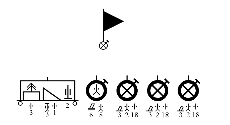 最上面那个旗帜代表师部,配了两挺MG34重机枪。右侧那个带轮子的骨灰盒代表制图部门,里头有一群苦逼勘探/绘图员。