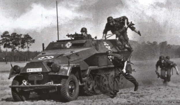 咱们经常会看到那些从半履带上跳下来冲锋的德军,这票人就是属于机械化步兵连的,常规步兵师下属的部队是没资格配发半履带运兵车的~
