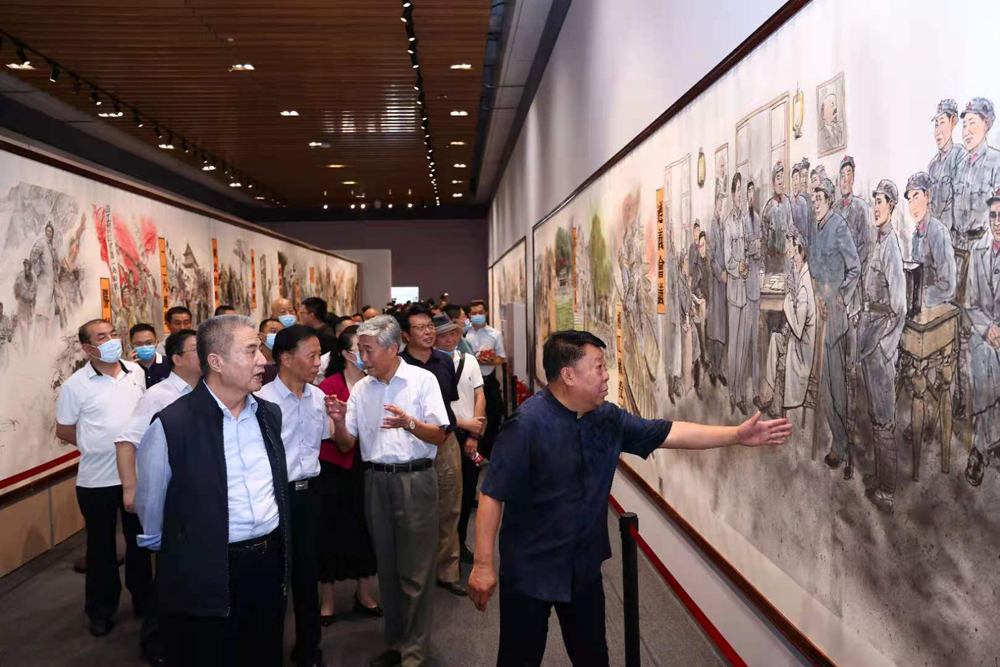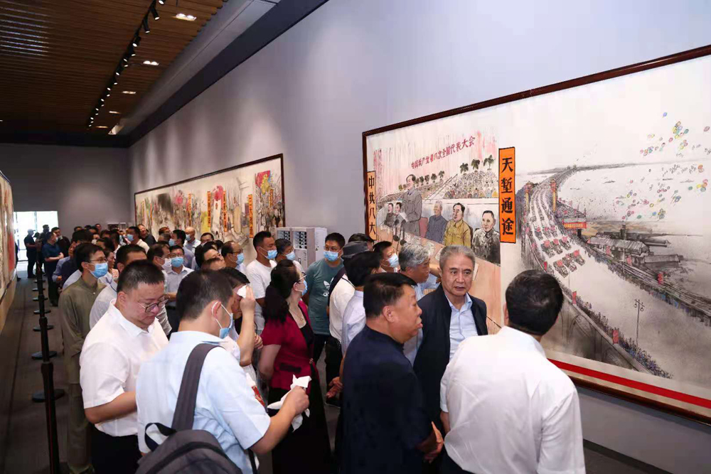 画展首日,慕名而来的市民、游客络绎不绝。本次展出的画作《信仰的红色印记》由海南省文联副主席李福顺创作,画作长达180米,高2米,共104个画面。采用中国传统水墨画的形式,描绘了中国共产党自成立以来100年波澜壮阔的历史。