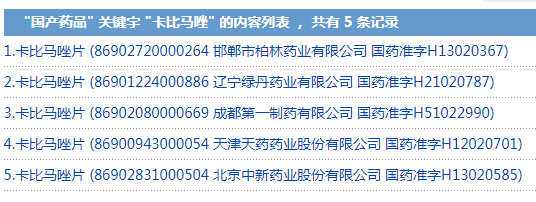 根据公告要求,卡比马唑片的上市许可持有人均应依据《药品注册管理办法》等有关规定,按照相应附件要求修订说明书,于2021年9月8日前报省级药品监督管理部门备案。国家药监局数据库查询显示,目前国内卡比马唑片的生产企业共有5家。