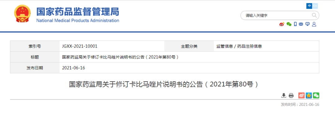 6月16日,国家药监局发布关于修订 卡比马唑片 说明书的公告。根据药品不良反应评估结果,为进一步保障公众用药安全,国家药监局决定对卡比马唑片说明书【不良反应】、【禁忌】、【注意事项】等项目进行统一修订。