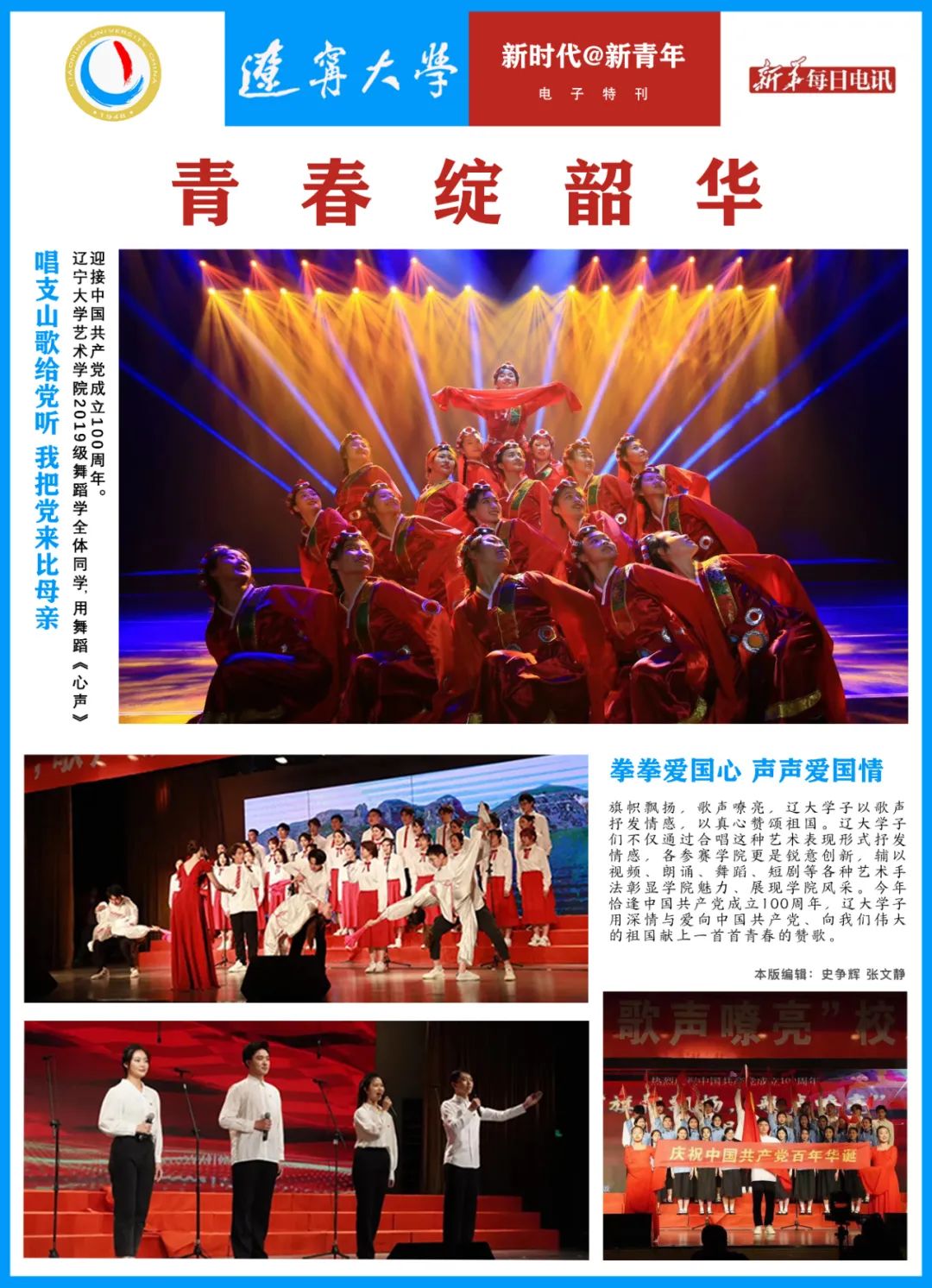 旗帜飘扬,歌声嘹亮,辽大学子以歌声抒发情感,以真心赞颂祖国。辽大学子们不仅通过合唱这种艺术表现形式抒发情感,各参赛学院更是锐意创新,辅以视频、朗诵、舞蹈、短剧等各种艺术手法彰显学院魅力、展现学院风采。今年恰逢中国共产党成立100周年,辽大学子用深情与爱向中国共产党、向我们伟大的祖国献上一首首青春的赞歌。(本版编辑:史争辉、张文静)