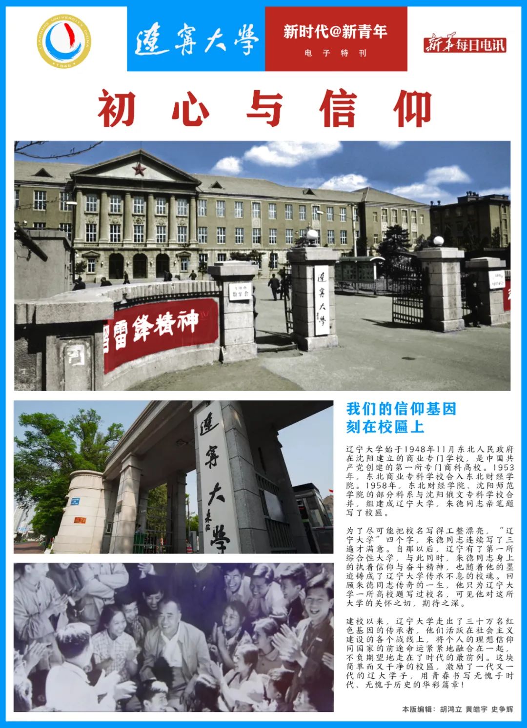 建校以来,辽宁大学走出了三十万名红色基因的传承者,他们活跃在社会主义建设的各个战线上,将个人的理想信仰同国家的前途命运紧紧地融合在一起,不负期望地走在了时代的最前列。这块简单而又干净的校匾,激励了一代又一代的辽大学子,用青春书写无愧于时代、无愧于历史的华彩篇章!(本版编辑:胡鸿立、黄皓宇、史争辉)