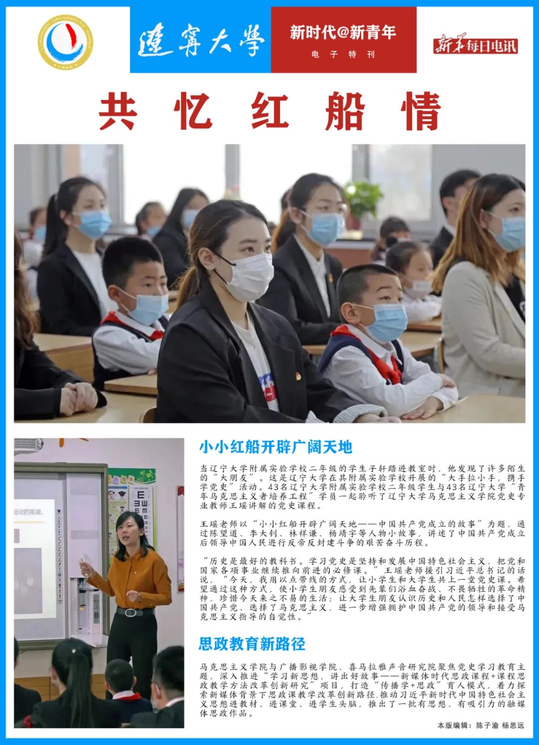 马克思主义学院与广播影视学院、喜马拉雅声音研究院聚焦党史学习教育主题,深入推进“学习新思想,讲出好故事——新媒体时代思政课程+课程思政教学方法改革创新研究”项目,打造“传播学+思政”育人模式,着力探索新媒体背景下思政课教学改革创新路径,推动习近平新时代中国特色社会主义思想进教材、进课堂、进学生头脑,推出了一批有思想、有吸引力的融媒体思政作品。(本版编辑:陈子渝、杨思远)
