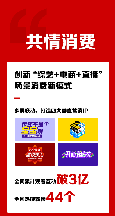 数据显示,苏宁易购今年推出的两大综艺IP——“六一宝宝节”和“脱口秀毕业会”,全网累计观看互动量破3亿人次,喜提44次热搜话题。网友纷纷评论,表示苏宁不愧是电商界的文体委,不仅爱玩,还“会玩”。