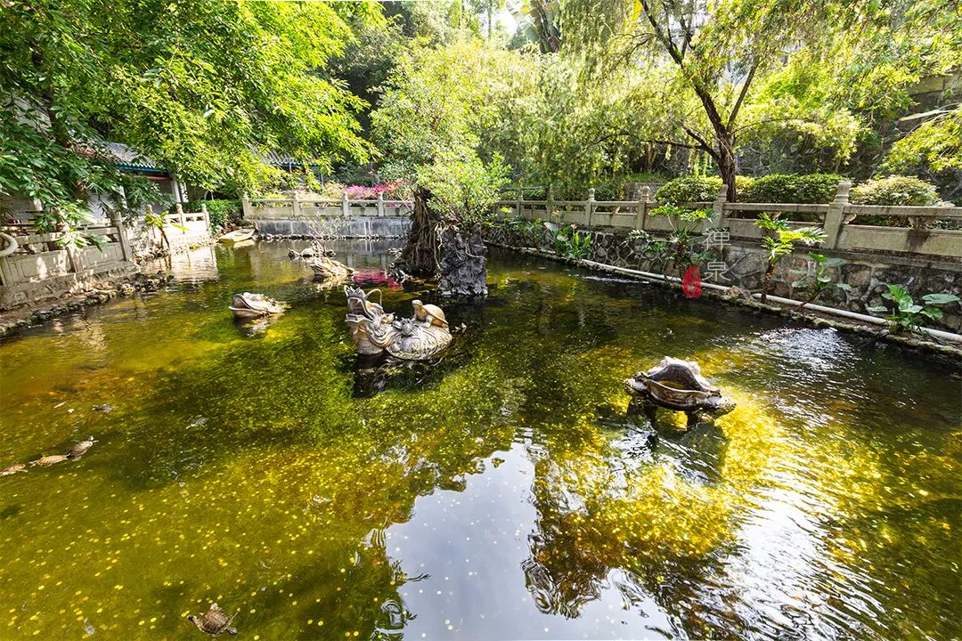 由于地形的关系,国恩寺的放生池不在山门的正前方,而在来的路边,也被叫做仙龟池。池中几只大嘴的蟾蜍,非常逼真。