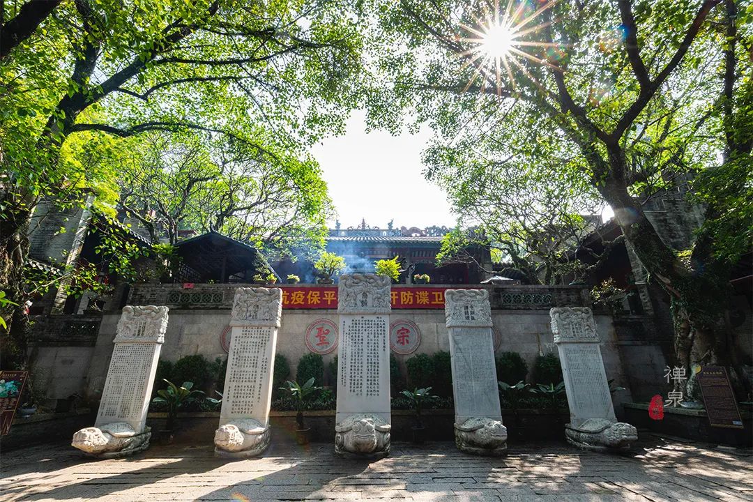 天王殿后,是一排五通巨碑,被两棵绿树遮盖着。石碑背后的墙上写着“禅宗圣地”四个大字。
