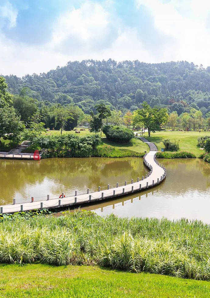 湖中修建了木道、码头、亲水平台、水栈道等景观,在极度自然之中增加了一丝规整的感觉。远处是层层叠叠的绿意,近处是澄净无波的湖泊,多想时间就停在这一刻。