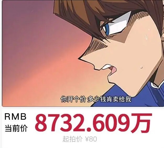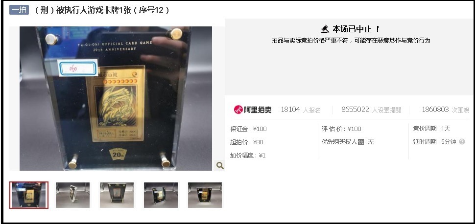 今日(6月21日)阿里拍卖网站上,一张“20 周年纪念版青眼白龙”金卡上线拍卖,起拍价为80元,截至16时32分,拍卖价已高达87326098元,同时也因“拍品与实际竞拍价格严重不符,可能存在恶意炒作与竞价行为”被迫中止。