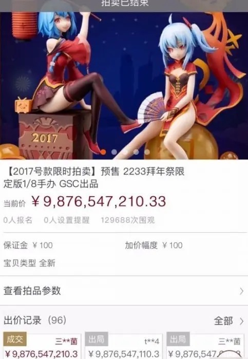 此前在2017年,视频网站哔哩哔哩曾举行过手办拍卖会,由于用户恶意竞拍,最后一位名为“三**菌”的用户以9876547210.33元拍下编号为2017的手办。而事后哔哩哔哩官博发出公告:他们联系到了最后拍得的买主,对方表示是“我弟弟瞎玩的,我表示歉意。并没有能力支付。”之后B站宣布将联合淘宝拍卖平台对此事进行调查,并保留进一步采取法律手段的权利,并在三日后,公布2017号编号手办的处理方案。最终2017号手办交易关闭后,在竞拍中真实出价最高的用户“t**8”可以以手中的2233号手办,置换2017号手办,且不产生38800元外的任何加价。2233号手办将收回公司,于办公区作展示之用。
