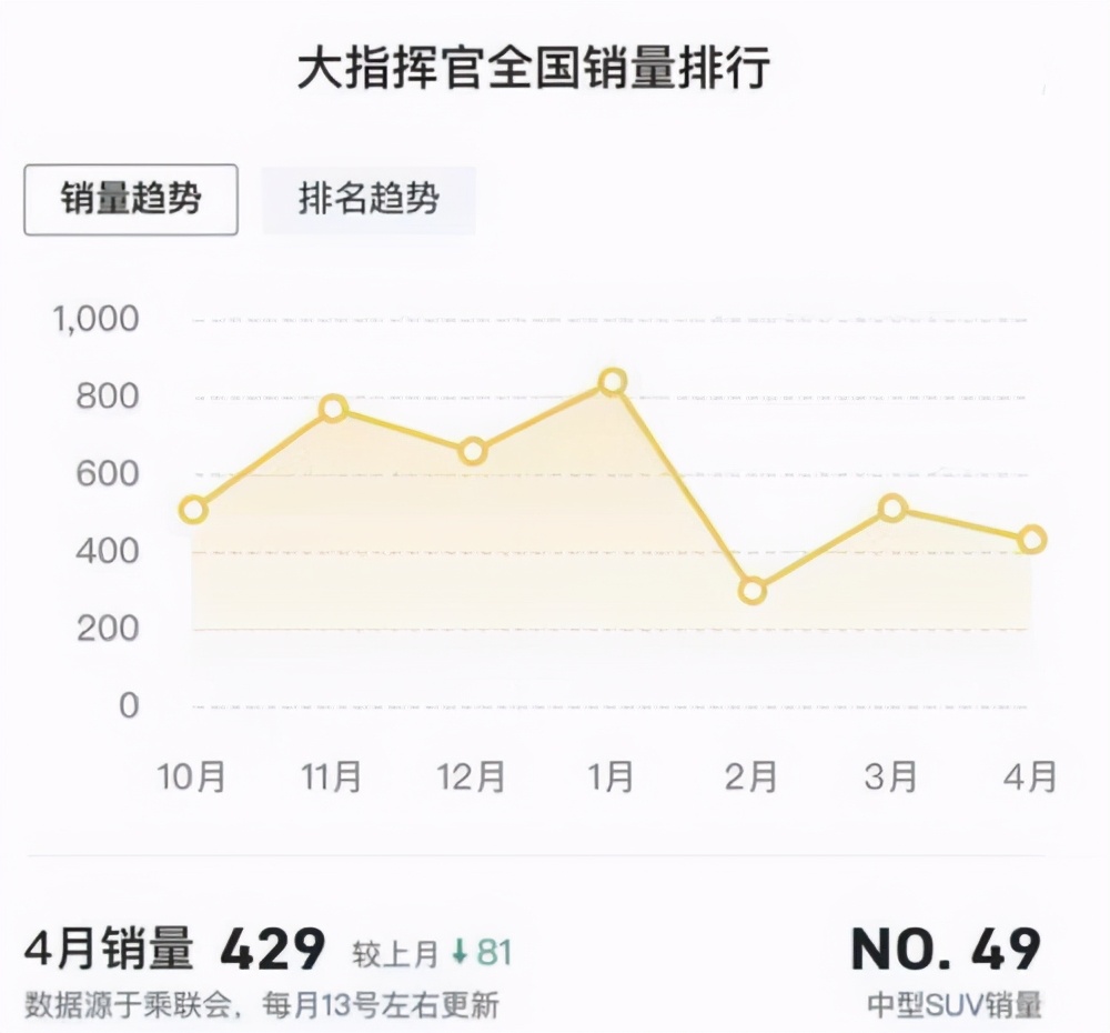 不论是吐槽,还是争论,毕竟一款车好坏,市场销量是其很重要的一项指标。通过近六个月的销量来看,Jeep大指挥官,这款被品牌商机寄予厚望的中型SUV市场销量可谓惨淡,即便销售最高的一月份,也没超过一千辆。而且这半年来,销量还逐渐成下滑趋势。过去的四月份,也只卖了四百多台。跟同级别的SUV来比,不可同日而语,销量可谓惨不忍睹。