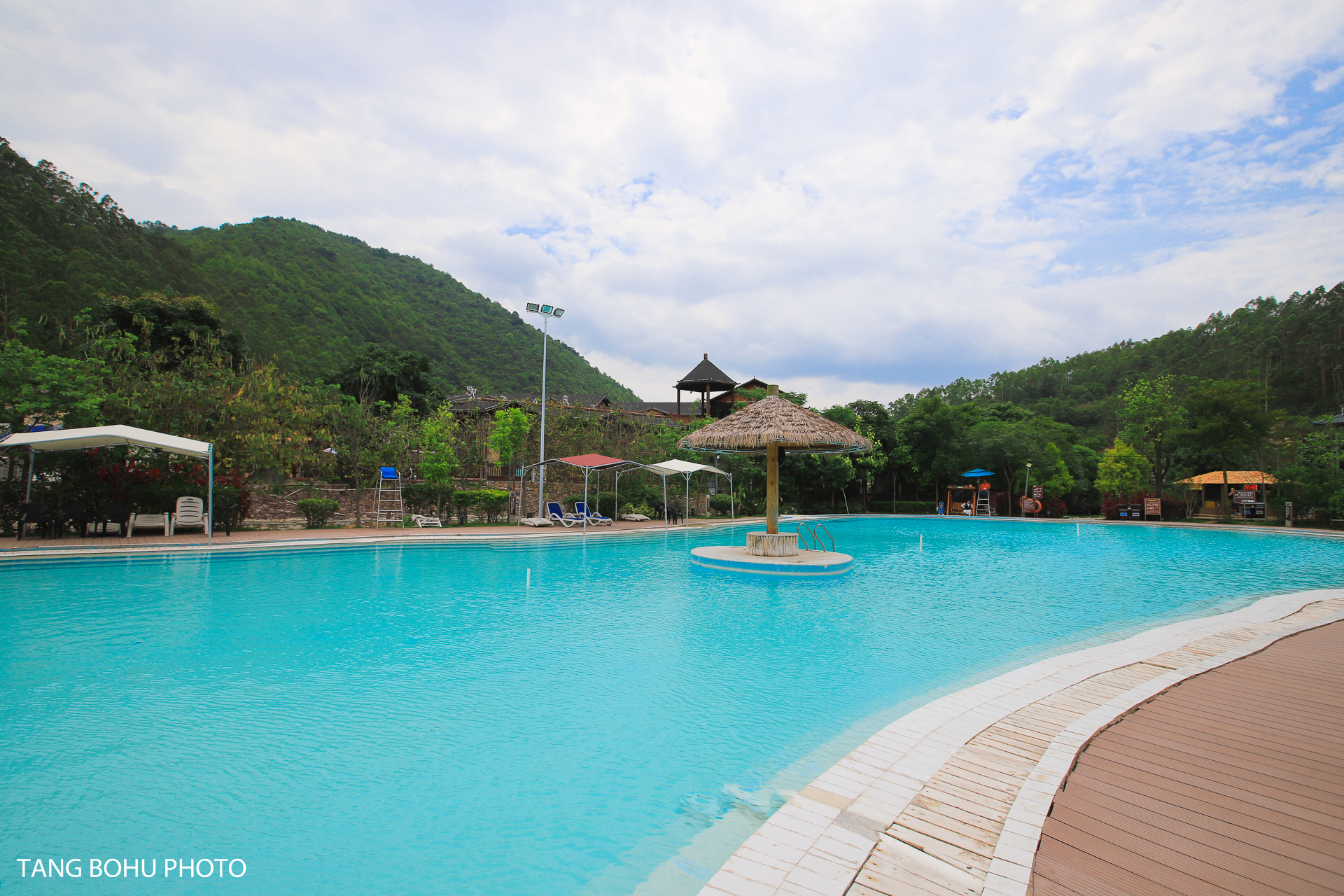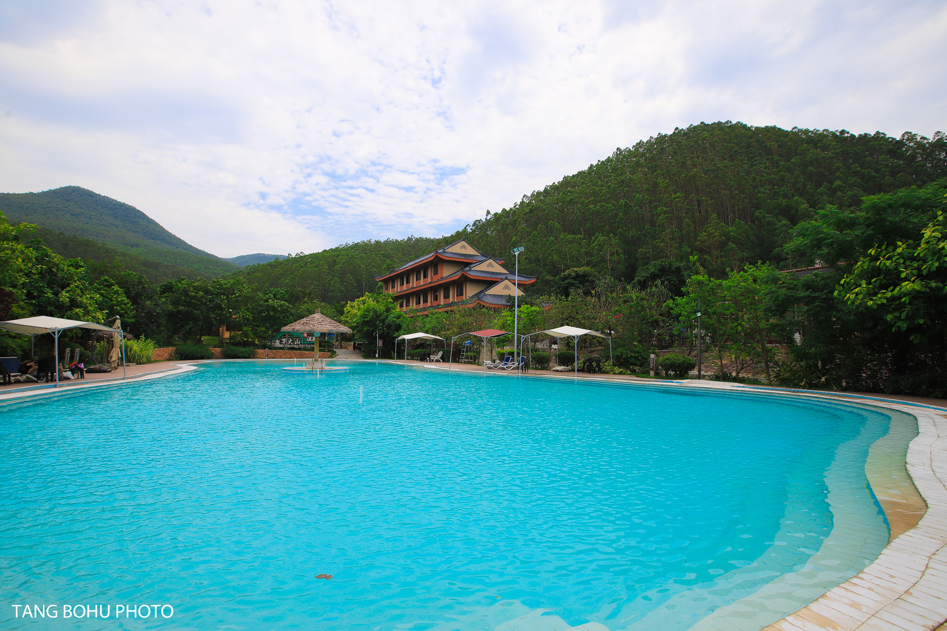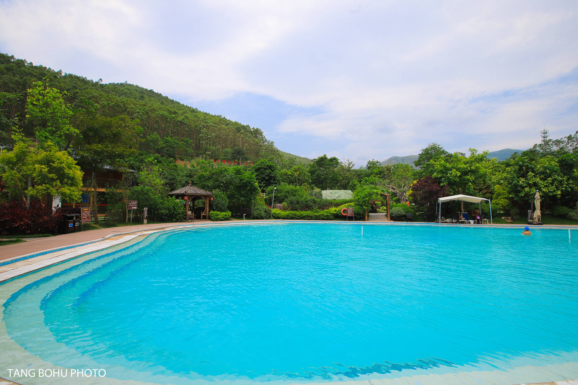 景区进门后左手边还有一个大的游泳池,这里也是蓝色的温泉水,看上去就很想去游泳一样,水很蓝,去的时候就看到一些游客专门到这里来泡温泉的。在大的游泳池旁边有好几个小的温泉池比较私密。景区里面还有民宿,水上木屋,房车等等住宿,如果到这里比较晚了,不防选择在这里住上一晚,一边可以泡温泉,一边可以享受这里的宁静。