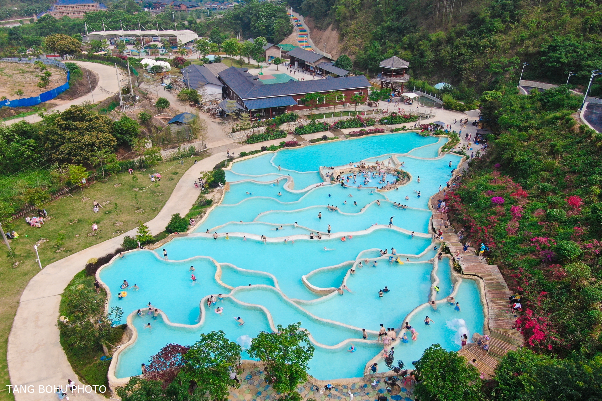 这里三面环山,一面临水,层林叠翠。我迫不及待地走到网红温泉前,远望一层又一层的瀑布,仿佛是在城堡上铺满了棉花一般,走近看才会发现是一池一池的蓝色温泉。这个在景区里叫温泉叠瀑的景观,层层叠叠的泉水很是壮观,发现这里的温泉水是蓝色的,也被称为蓝泉。在这里泡温泉,欣赏温泉叠瀑的景观真的很惬意。值得前来打卡。