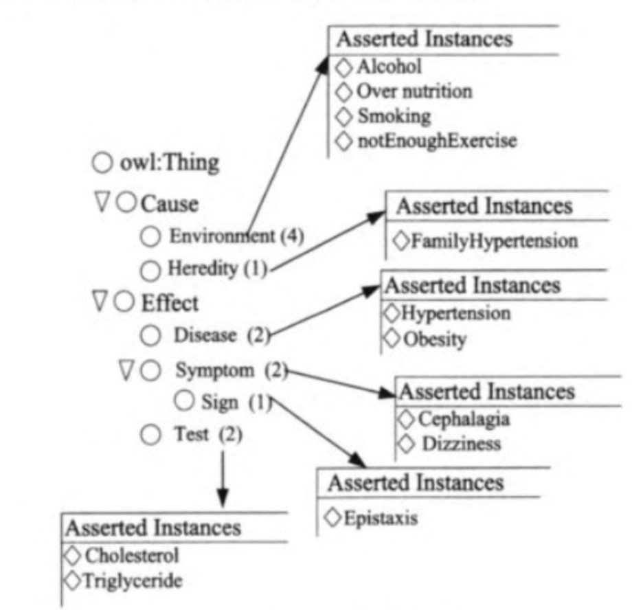 首先要描述领域中的关键概念,可将其分为原因和结果两大类。在医学本体中,原因的子类有环境和遗传等,结果的子类有疾病、症状、病症和检验。